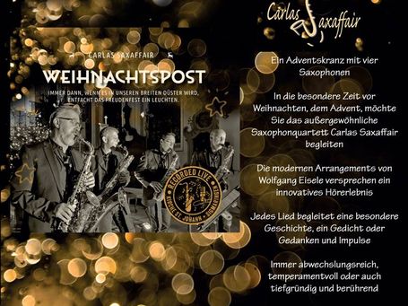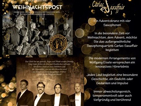 Carlas Markenzeichen sind die Eigenkompositionen von Wolfgang Eisele. Individuell zugeschnitten auf jedes Konzert und jeden Event kann das SaXofonquartett sein Publikum begeistern. Die neue Musik ist jetzt auch live zu erleben: